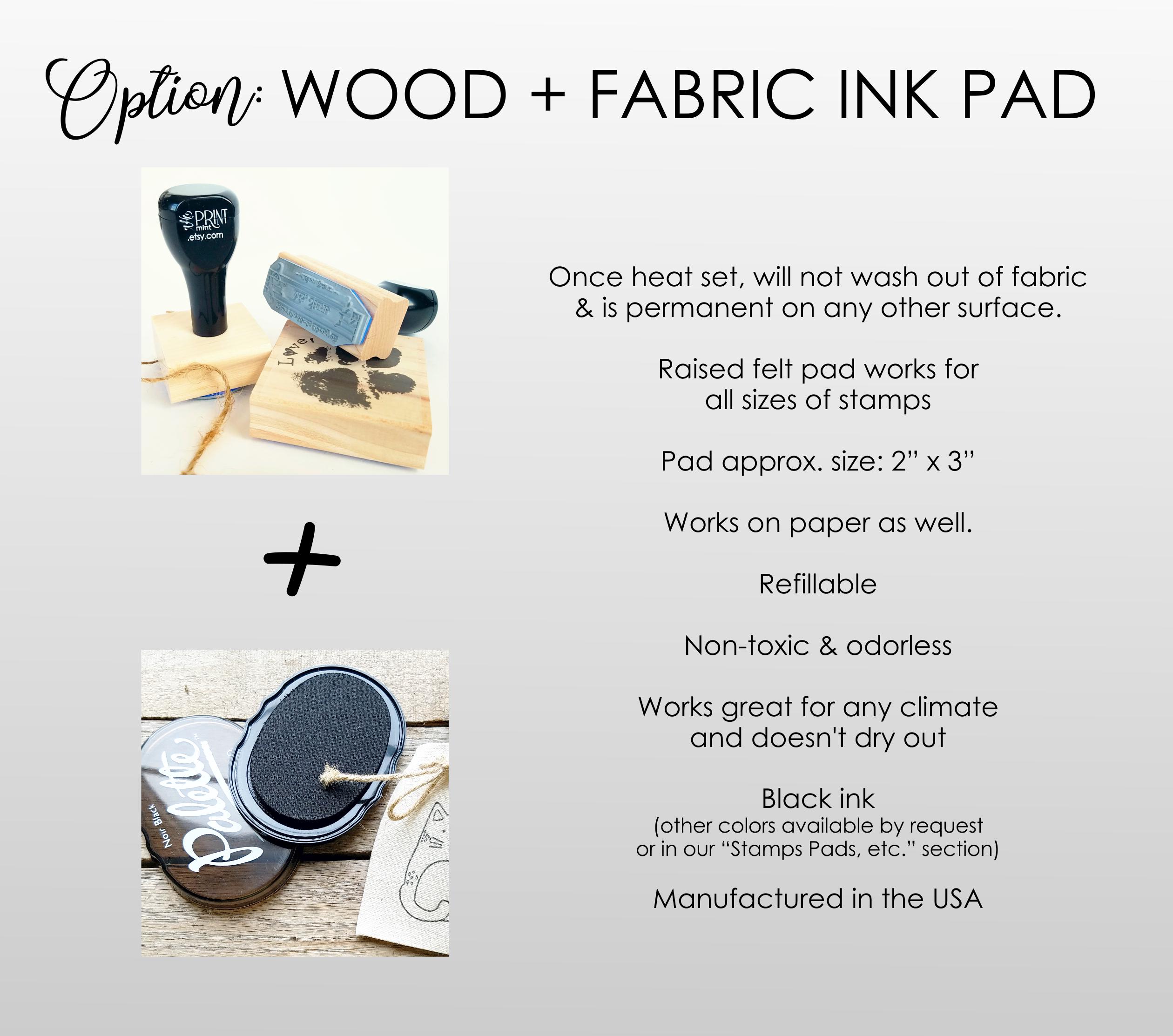 - Fabric ink stamp pad: any surface, heat-setting required for permanence on some surfaces
